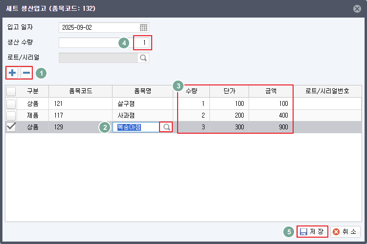 [세트 생산입고]창에는 BOM에 등록되어있는 정보가 불러와지며,