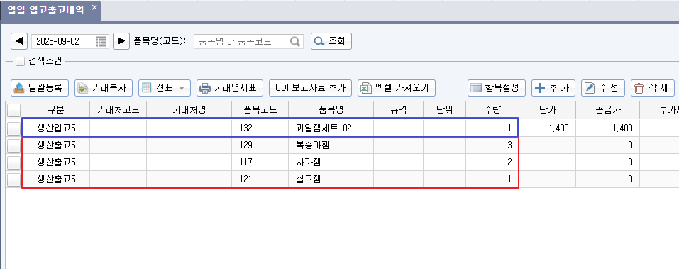 ④ 생산출고/생산입고된 내역은 [물류/재고] - [일일/기간 입고출고내역]에서 확인 가능합니다.