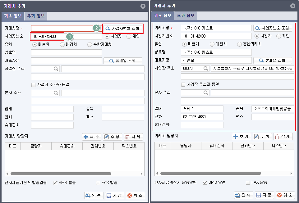 아래와 같이 해당 사업자의 거래처명/주소/업태/종목/연락처 등 정보를 불러와 저장할 수 있습니다.