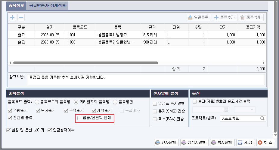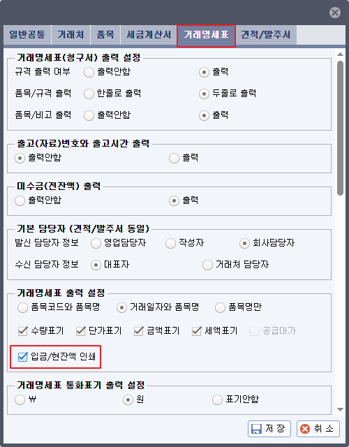 [환경설정] - [공통기초] - [거래명세표] - [거래명세표출력설정] - 입금/현잔액 인쇄 설정이 추가되었습니다.