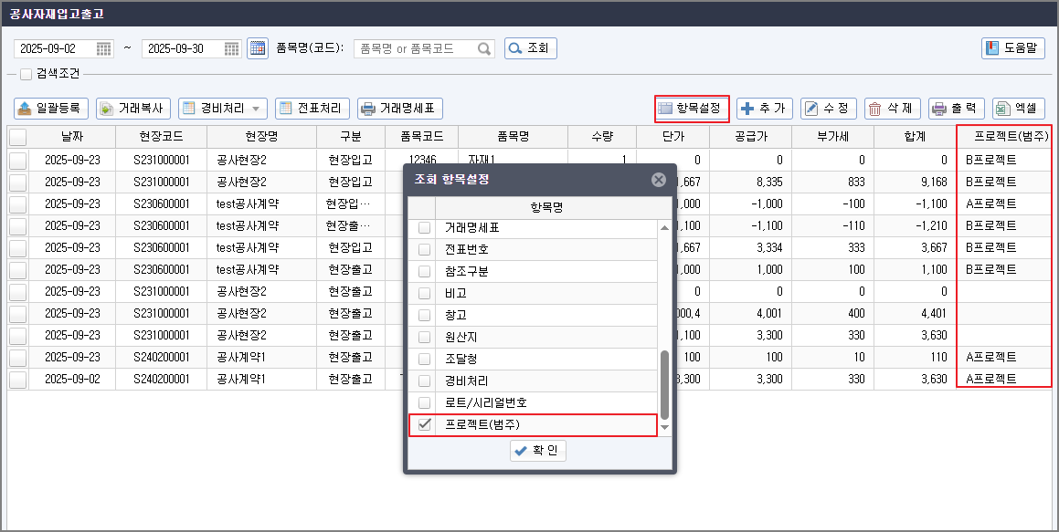 [현장공사] - [공사자재입고출고] - 오른쪽 상단의 [항목설정]을 누른 후 [프로젝트(범주)]에 체크한 후 [확인]을 누르면