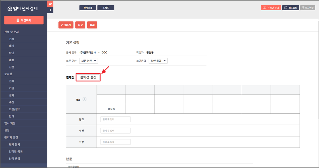 [결재선 설정]을 클릭하여 결재, 참조, 수신, 회람 결재선을 설정할 수 있습니다.