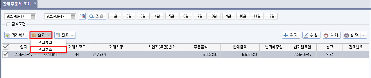 [판매매출]-[판매주문서 조회] 메뉴에서 출고처리가 완료된 품목의 부분출고 취소가 가능합니다.