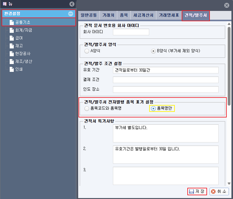 견적/발주서 전자발행시 품목코드 없이 품목명만 표기하시려면 [품목명만]을 선택 후 저장합니다.