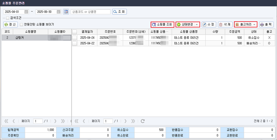 [쇼핑몰 조회]를 클릭하여 주문을 수집하고, [상태변경]을 클릭하여 주문상태를 변경할 수 있습니다.