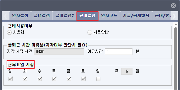 참고로, 근무 요일은 [환경설정] - [급여] - [근태설정] - [근무요일 지정] 에 지정하신 요일로 반영됩니다.