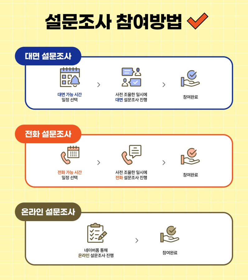 ② 사전 조율한 일시에 대면 설문조사 진행 ③ 참여 완료! |