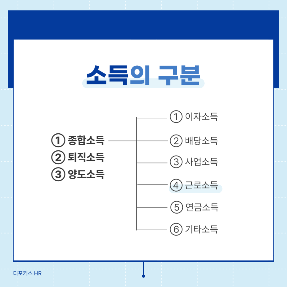 소득은 크게 종합소득, 퇴직소득, 양도소득으로 구분할 수 있는데, 이 중 종합소득의 종류에는 ①이자소득, ②배당소득, ③사업소득, ④근로소득, ⑤연금소득, ⑥기타소득이 있습니다. 이번 글에서 우리가 살펴볼 소득은 바로 근로소득입니다.
