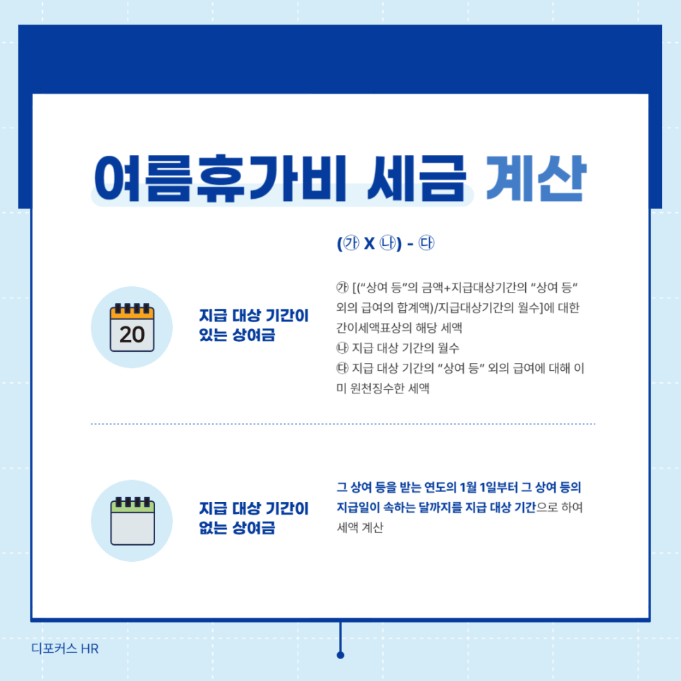 여름휴가비 세금은 지급 대상 기간이 있는 상여금과 지급 대상 기간이 없는 상여금으로 구분해 계산할 수 있습니다.