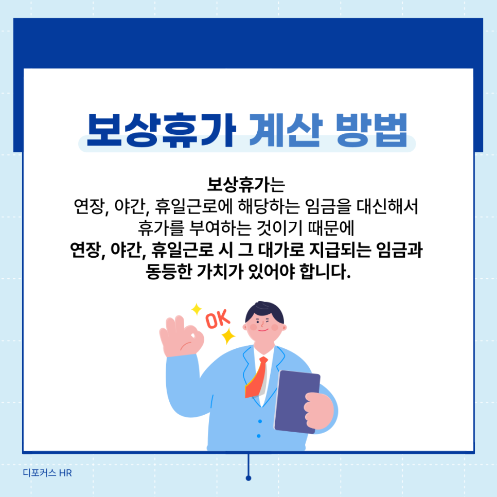 보상휴가는 연장, 야간, 휴일근로에 해당하는 임금을 대신해서 휴가를 부여하는 것이기 때문에 연장, 야간, 휴일근로 시 그 대가로 지급되는 임금과 동등한 가치가 있어야 합니다.