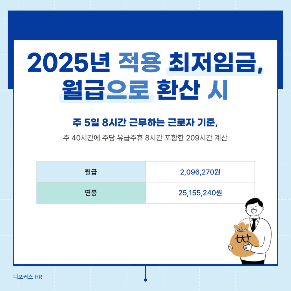 주 5일 8시간 근무하는 근로자 기준, 주 40시간에 주당 유급주휴 8시간 포함한 209시간으로 계산하면 내년 2025년 예상 월급 환산액은 2,096,270원입니다. 연봉 기준으로는 25,155,240원입니다.
