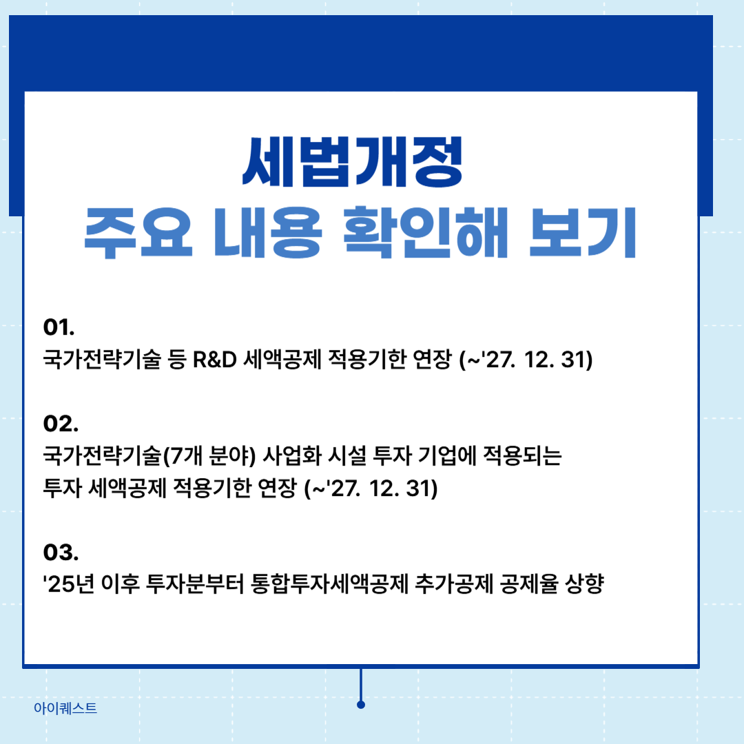 특히 이번 개정 사항에서는 연구인력개발비(R&D)세액공제와 통합투자세액공제에 대한 내용을 눈여겨 보셔야 합니다. 이 두 공제 제도는 기존에 '24년까지만 적용 될 예정이었으나 세법개정으로 적용기한이 2027년 12월 31일까지로 연장되었습니다. 또한 공제율 등이 변경되면서 더 많은 기업이 혜택을 받을 수 있게 되었으므로, 반드시 개정된 내용을 확인하여 공제 혜택을 받아보시기 바랍니다.