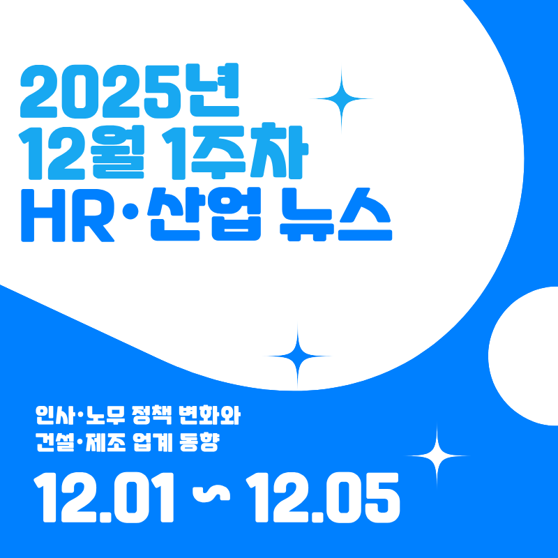 2025년 12월 1주차 HR·산업 뉴스 클리핑 | 인사·노무 정책 변화와 건설·제조 업계 동향일을 하다 보면 “이번 달에 또 뭐가 바뀌었지?” 싶을 때 많으시죠.특히 인사·노무 쪽 제도나 업계별 이슈는 놓치면 나중에 바로 업무 리스크로 이어지기도 합니다.그래서 준비했어요.👉 2025년 12월 1주차 HR·산업 뉴스 클리핑이번 주에는 어떤 있었는지, 지금부터 같이 살펴보실까요?1. HR·인사/노무 주요 뉴스 (25. 12. 01~ 12. 05 기준)NO.기사 제목언론사1노동부 내년 예산 37조6천761억원 확정…올해보다 6.6%↑연합뉴스2300인 이상 기업 41%… “내년 채용규모 줄일 것”동아일보3내달부터 임금체불 1건만 접수해도 사업장 체불여부 전수조사이데일리4"퇴사하는데 성과급 반납하라고…돌려..