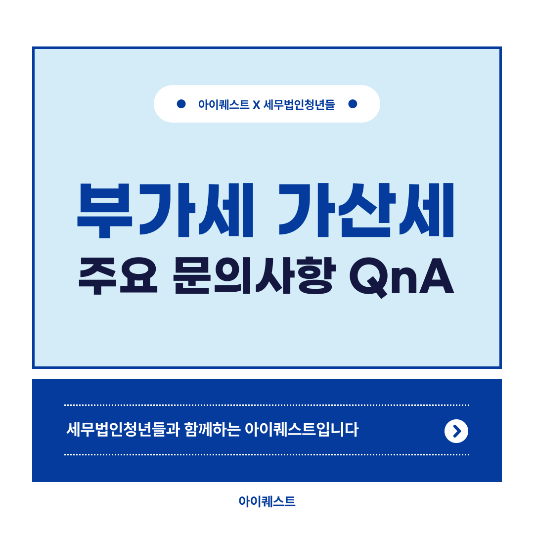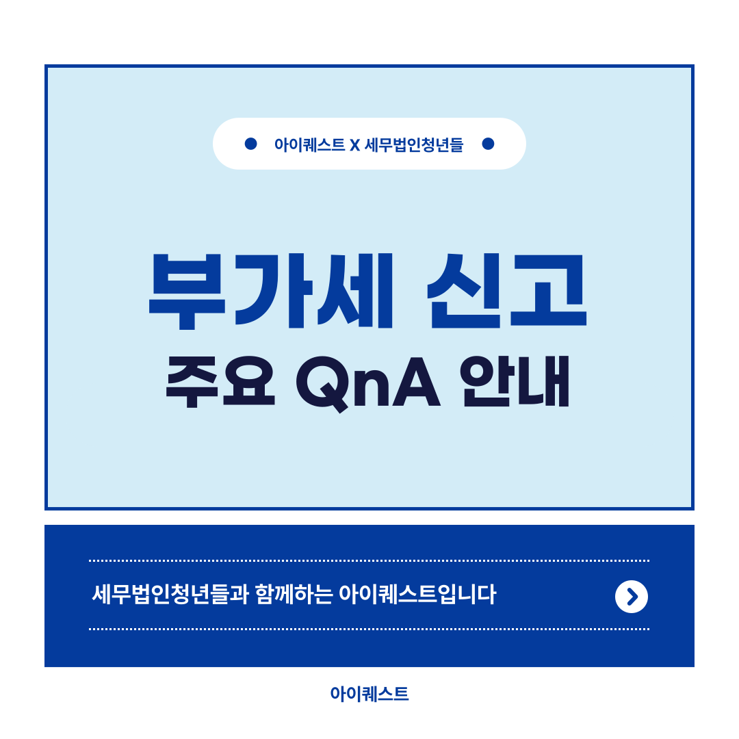 안녕하세요.세무법인청년들과 함께하는 아이퀘스트입니다.​​오늘은 부가세 신고 관련 주요 QnA에 대해 안내드리겠습니다.​ 부가세 가산세부가가치세 납세 의무가 있는 사업자는 성실하게 부가세를 신고 및 납부하여야 합니다. 부가세를 신고·납부하지 않거나 사실과 다르게 신고하는 경우에는 가산세가 부과됩니다. 특히 부가세의 경우에는 신고와 납부에 각각 가산세가 부과되기 때문에, 납세 의무를 불성실하게 이행하는 경우에는 세 부담이 더욱 커지게 됩니다.​만약 부가세를 기한 내 신고·납부하지 못하였거나 신고 내용에 누락이나 오류가 있어 가산세가 부과되었다면, 가산세를 감면받을 수 있도록 최대한 빨리 수정신고 등의 조치를 취하셔야 합니다. 다만 부가세가 부과된 사유에 따라 처리 방식 등이 달라질 수 있으며, 경정청구를 진..