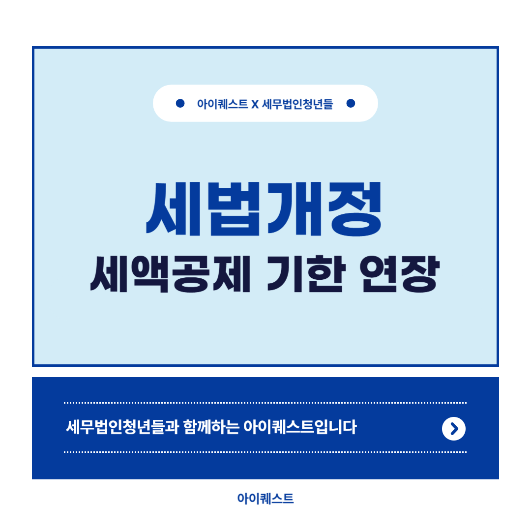 안녕하세요.세무법인청년들과 함께하는 아이퀘스트입니다.​​오늘은 2024년 세법개정 - 세액공제 적용기한 연장 등에 대해 안내드리겠습니다.​​​2024년 세법개정정부는 투자·고용·지역발전 촉진을 위하여 지난 7월 2024년 세법개정안을 발표하였습니다. 개정안에는 민생경제 회복과 기업 지원 등에 대한 내용, 재정비되는 조세체계 등이 포함되어 있습니다. 사업자는 개정안 중 특히 경제 역동성 지원을 위한 다양한 개정 사항을 확인해보셔야 합니다.​세법 개정 내용을 확인하시면 기업이 적용받을 수 있는 다양한 공제 등을 확인할 수 있습니다. 또한 공제별 적용 시기나 기한, 요건, 공제율 등을 확인할 수 있기 때문에 반드시 관련 내용을 확인해보시기 바랍니다. 개정 사항을 확인하지 않는 경우에는 공제를 올바르게 신청 및..