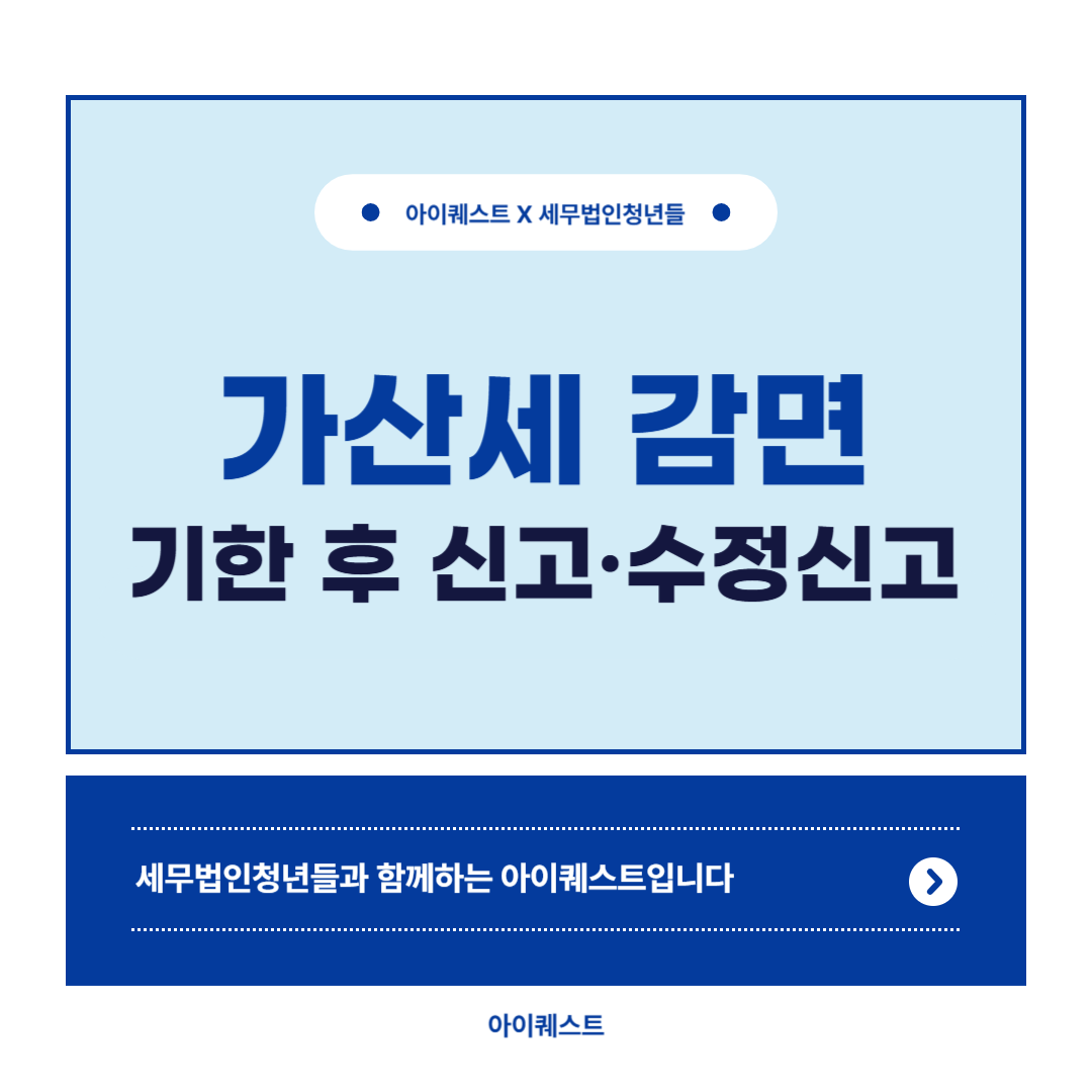 안녕하세요.세무법인청년들과 함께하는 아이퀘스트입니다.​​오늘은 가산세 감면 방법에 대해 안내드리겠습니다.​​​부가가치세 가산세부가세법상 모든 사업자는 성실하게 부가가치세를 신고 및 납부할 의무가 있으며, 의무를 이행하지 않는 경우에는 가산세가 부과됩니다. 사업자는 과세대상 기간 동안의 부가세 실적을 정확하게 파악하여 법정 기한 내에 신고하여야 하며, 신고 내용에 누락이나 오류 등이 발생하지 않도록 유의하여야 합니다. ​부가세를 법정 기한까지 신고·납부하지 않으면 가산세가 부과되며, 기한 내 신고를 진행하셨더라도 신고 내용에 누락이나 오류 등이 있는 경우에는 가산세가 부과됩니다. 가산세는 특히 매출을 고의 또는 단순 실수로 누락하는 경우, 공제받지 못할 매입세액을 부가세에서 공제하는 경우 등 많은 경우에 ..