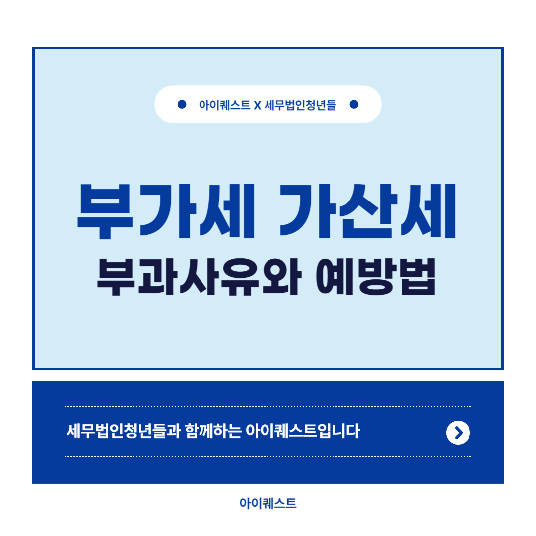 안녕하세요.세무법인청년들과 함께하는 아이퀘스트입니다.​​오늘은 부가세 가산세 부과 사유 및 예방법에 대해 안내드리겠습니다.​​  부가세 가산세 가산세란 납세자가 세금을 성실하게 신고·납부하지 않은 경우에 추가로 부과되는 세금입니다. 가산세는 납세자의 성실 납세 의무를 강화하고, 세무 행정의 신뢰성을 높이기 위하여 도입되었습니다. 특히 부가가치세를 성실하게 납세하지 않은 경우에는 다양한 종류의 가산세가 부과될 수 있습니다. 가산세 중에는 하루마다 매일매일 부과되는 종류도 있으며, 이러한 가산세가 부과되는 경우에는 세 부담이 크게 늘어날 수 있으므로 성실하게 납세 의무를 이행할 수 있도록 유의하시기 바랍니다.​부가가치세의 경우에는 불성실한 신고와 납부에 각각 가산세가 부과됩니다. 이에 따라 법정 기한 내에 ..