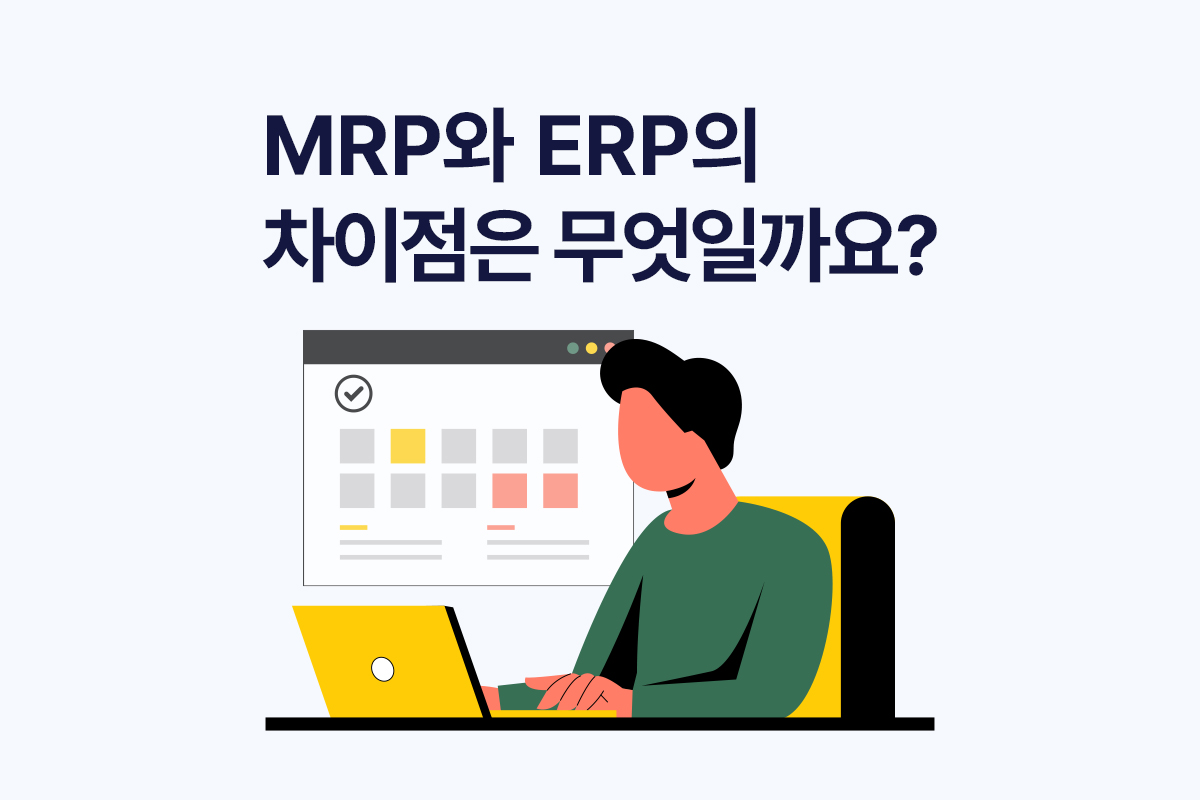 ​ MRP는 뭐고, ERP는 또 뭔가요?  생산 프로세스의 기초는 바로 자재 관리입니다. 생산 자재의 계획과 입고, 생산, 출고 등 모든 프로세스에서 자재가 적재적소에 효율적으로 투입돼야 생산성을 높일 수 있어요.​자재 관리 업무를 담당하면 MRP(자재 소요량 계획)라는 것을 접하게 됩니다. 그리고 MRP와 비슷한 용어로 ERP(전사적 자원 관리)가 있죠.​효율적인 자재 관리를 위해 기업에서는 MRP와 ERP를 통합하여 활용하고 있습니다. 그럼 MRP와 ERP는 구체적으로 어떤 차이점이 있는 걸까요?​이번 글에서는 [얼마에요]와 함께 MRP와 ERP를 자세하게 알아보도록 할게요.​​1. MRP(자재 소요량 계획)와 ERP(전사적 자원 관리)의 정의MRP는 ‘Material Requirements Plan..